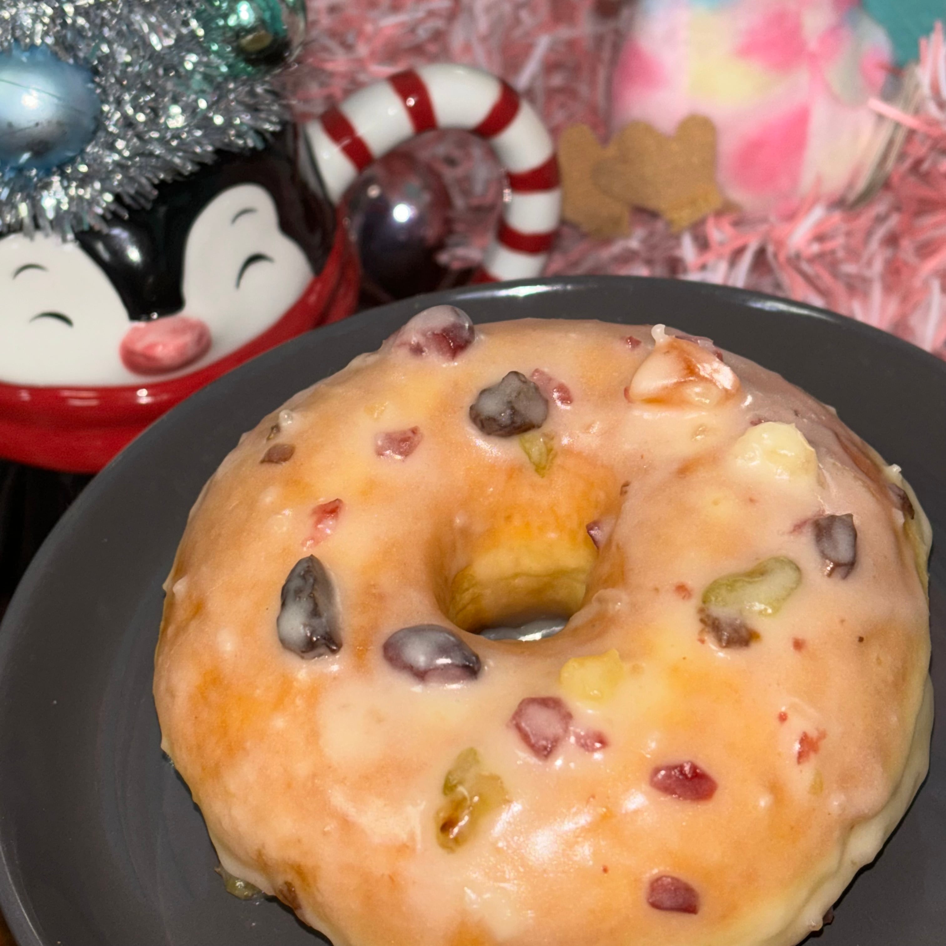 甘いグレーズに色とりどりのフルーツとラム酒の風味が合わさった、クリスマスのお祝いにピッタリなドーナツ♡